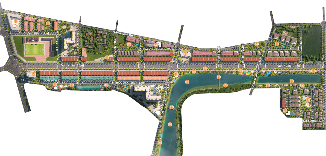 45++ tiện ích được tính toán kỹ lưỡng xuyên suốt tạo tiền đề hình thành "đời sống phố" cho cư dân: Từ chợ Hưng Lộc - chợ dân sinh kiểu mới; công viên trung tâm bên sông Lam Giang êm đềm đến các tiện ích nâng tầm chuẩn sống như nhà văn hóa, khu vui chơi, sân pickleball, các khu vườn nghệ thuật...