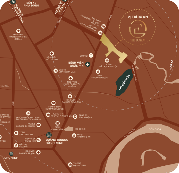 Kết nối tiện lợi tới các cơ quan hành chính, trường học, bệnh viện, TTTM, các điểm nổi bật của thành Vinh trong bán kính 3 - 5km chỉ từ 2 - 5 phút. Đầy đủ tiện ích ngoại khu từ chợ, sông hồ cảnh quang... đến các khu vui chơi ngay trong 25ha của khu đô thị.